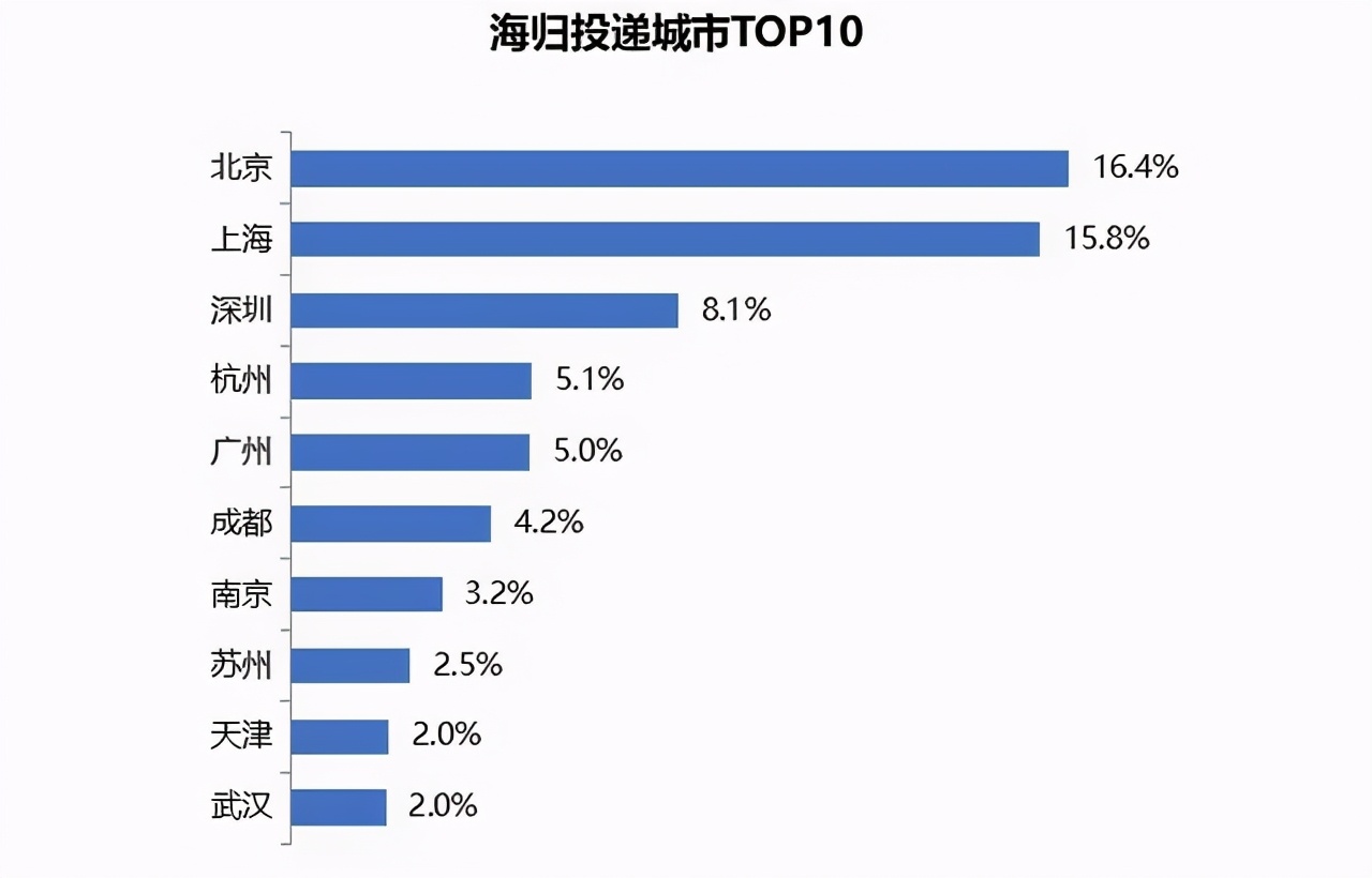 智联招聘于今年年初发布了《2020中国海归就业创业调查报告》,数据显示,成都的海归投递率为4.2%,全国排名第六,在新一线城市里仅次于杭州。